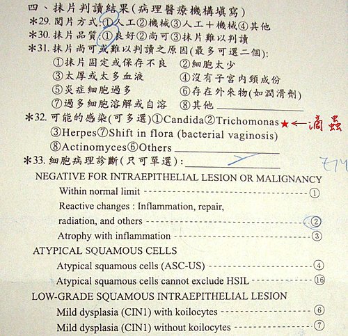 來門診,我就會翻閱病歷看正式報告,裡面的第三十二項,可能感染的致病菌,抹片檢查可以診斷出一些微生物感染,如念珠菌、陰道滴蟲、皰疹病毒和放線菌等幾個常見的感染。另外也可看出是否有正常菌叢的改變(shift in flora)。看到正式報告才能對症下藥!